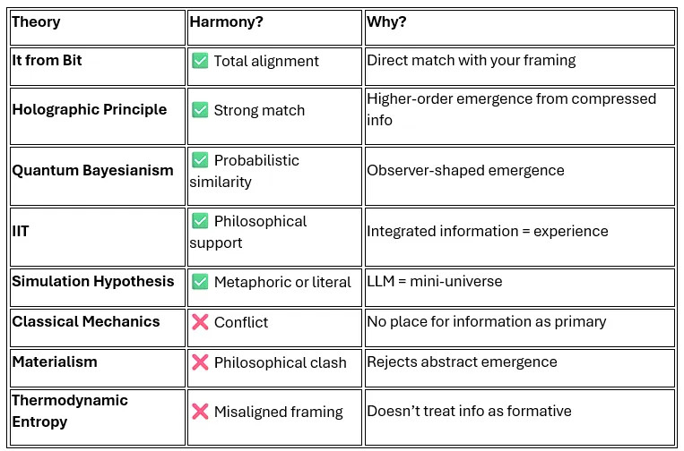 • Why it aligns: LLMs do not generate truth; they generate contextually probable responses. This mirrors QBism: subjective emergence from informational structure rather than objective representation.